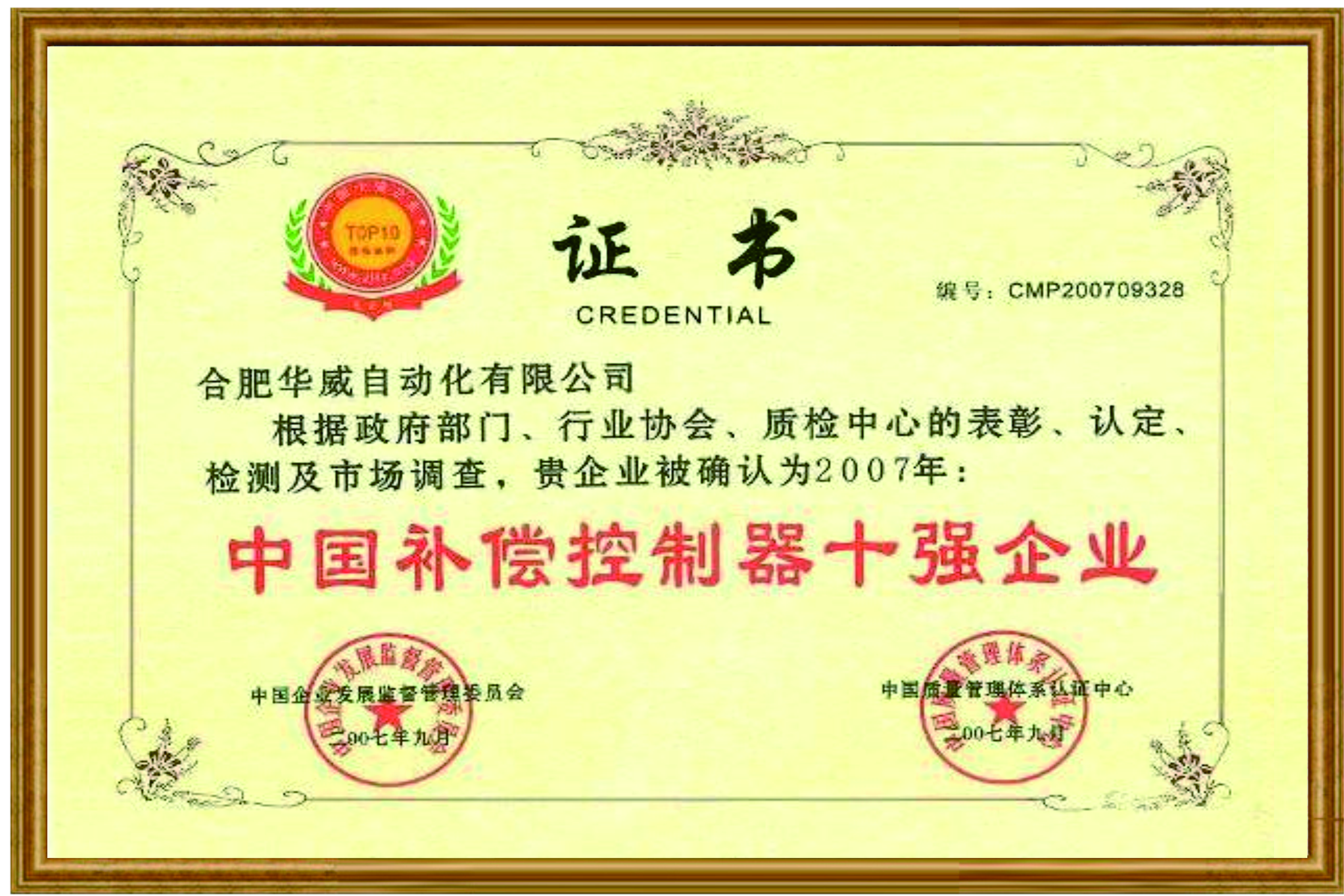 中国补偿控制器十强企业证书